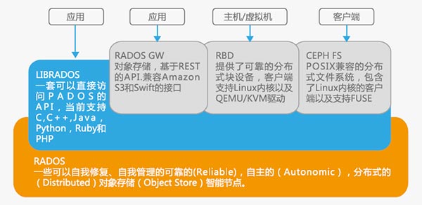 对于RADOS系统,节点组织管理和数据分发策略均有内部的监视器全权负责,所以,从客户端角度设计相对比较简单,它给应用提供的仅为简单的存储接口。