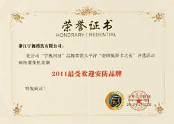 在太平洋安防网主办的“安防奥斯卡之夜”评选活动中,宇视HIC5421 1080P获“2011最受欢迎安防品牌”网络摄像机类别奖项。