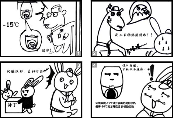 唉,这就要说到咱们第二个先进设计了,要省电啊,要节能啊,加热策略考虑的是保证球机内部各器件组件能正常工作即可,因此设定的加热开启温度过低。以红外球为例,环境温度低于-15℃才开启机芯局部加热,环境温度低于-30℃时才开启红外辅助加热。别人的不管三七二十一,低了就加热全开,自然就不冰了。