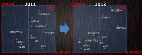 在安防行业竞争力象限中,宇视完成从第二阵营挑战者向第一阵营领导者的跨越,在销售规模持续追赶,并在创新能力上始终保持最前沿地位,并凭借创新向行业领跑者发起挑战。宇视专利申请总数400件,人均专利业内第一,其中发明专利占比89%,每三个工作日新增一件专利。2013年,围绕实战和破案率,宇视以智能交通、平安城市新建项目完成了云计算、大数据的实证,在业界率先实现了完整的端到端应用最佳实践。