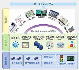 智能交通整体框架主要包括物理感知层、软件应用平台及分析预测及优化管理的应用。其中物理感知层主要是对交通状况和交通数据的感知采集;软件应用平台是将各感知终端的信息进行整合、转换处理,以支撑分析预警与优化管理的应用系统建设;分析预测及优化管理应用主要包括交通规划、交通监控、智能诱导、智能停车等应用系统。