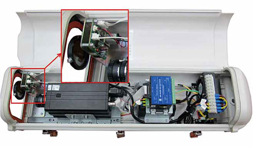 从打开的护罩中,可看到在摄像机镜头前端设置有一组带微电机进行升降控制的光学镜片。摄像机工作时通过感光系统及其嵌入式算法计算出当前时段的环境照度状况,当需要增强或减弱光线对图片清晰度的影响时,系统会自动向前端光学镜片电机发送升降光学镜片的指令,进而实现控制图像质量的目的。针对不同的应用场景、不同时段的照度特点,宇视科技针对性地开发了相应的成像处理技术。