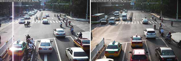 湛江电警二期项目测试现场使用减光镜前后图像如下: