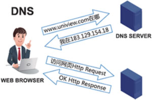 我们在访问互联网的时候,首先遇到的是网站的域名。但是当数据在网络上传输时,不管是成熟的IPv4 技术,还是最新的IPv6 技术,最终是通过一串以数字标识的IP 地址进行访问的。例如访问宇视官网时候使用以下地址www.uniview.com,但实际上访问的是183.129.154.18。DNS 正是承担从域名到IP 地址的翻译过程。有点像通讯录吧。
