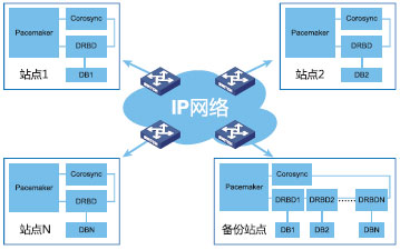 宇视科技通过在VM 上集成开源组件PACEMAKER、COROSYNC、DRBD,同时结合网络设备的特定功能,实现上述远程镜像和互联功能。DRBD 是一个用软件实现的、无共享的、服务器之间镜像块设备内容的存储复制解决方案。简单来说就是两台机器分别拿出一部分空间给DRBD 管理,两台机器会被区分为主机和备机,主机上的修改会被DRBD自动同步到备机上的相同位置,这样一来,我们在业务中做的修改会被自动备份到备机上,主机故障时,备机上的数据也是实时正确的,能提供正常的服务。DRBD 可以理解为一个跨网络设备的RAID1。备机上提供N 个DRBD 分区与N 个主节点的对应分区进行数据库的实时镜像备份。