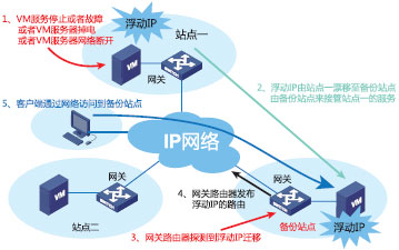 具体方案如下,用户对任意站点的配置信息和数据库修改通过DRBD 技术实时同步到远端备份站点,当备份软件系统检测到某个服务器节点异常断网或者进程异常后,将对应故障主节点的浮动IP 漂移到备用节点,由跨三层的备用服务器接管故障服务器的VM 功能,网络设备实时探测到浮动IP 漂移后,在路由协议中引入浮动IP 的主机路由,并发布全网,使全网的用户能正常的访问到备用服务器提供的服务。当主机排除故障,正常启动后,备份软件能将浮动IP 和业务功能切换回主节点,并通过与备机相连的网络设备撤销此前发布的主机路由,使全网的用户能正常的访问到主节点提供的服务。