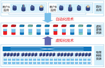 未来网络发展的主要技术趋势包括虚拟化、自动化、SDN(Software Defined Network,软件定义网络)等。虚拟化、自动化两者通常是组合在一起使用(如下图所示)。基于虚拟设备、虚拟通道、虚拟服务三个层面的虚拟化技术,将网络资源“池化”,变物理的网络设备为虚拟的网络资源池。虚拟化只是实现了资源的逻辑化,要提供网络云服务,自动化技术是必不可少的。基于虚拟化的网络资源,通过自动化编排技术,实现网络业务快速部署和变更,通过自动化管理技术,实现大型网络的高效管理。当我们在进行监控业务服务器虚拟化时,也必然要考虑到网络设备的虚拟化,譬如异地的服务器集群备份、监控数据的灾备等。