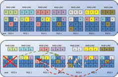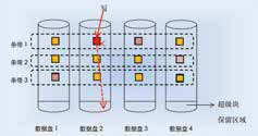 块虚拟化RAID-NT 技术,类似于3Par 块虚拟化Fast RAID 技术,将硬盘分成很多相同大小的虚拟磁盘VD。不同磁盘的虚拟磁盘组成具有RAID 属性的RAID-LUN。当一块硬盘故障,需要重建的时候,系统会知道该硬盘的VD 所涉及到的RAID-LUN。如下图,磁盘0 故障,磁盘0 所涉及的RAID-LUN0、 RAID-LUN2、RAID-LUN4 需要重构,RAID-LUN0 的重构块是硬盘3 上的块29,RAID-LUN2 的重构块是硬盘4 上的块38,RAID-LUN4 的重构块是硬盘2 的块19,这三条重构流可以同时执行。