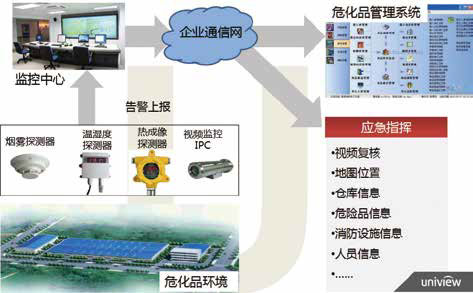 宇视可视化智慧安监方案基于开放的IMOS 平台,通过接入相关的智能环境探测器,报警联动视频,并将环境信息、视频监控融合到企业安全生产应用系统和危险品监管中,可以应用在危化品的生产、运输、仓储、销售等各个环节,包括厂房、港口、仓库、站点等。
