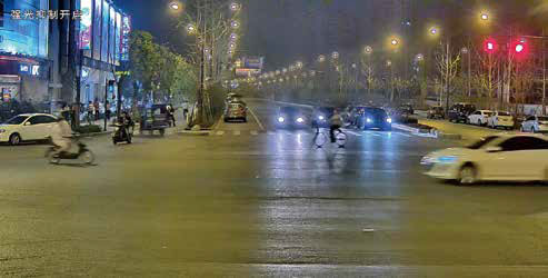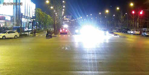 另一个衡量道路监控摄像机最重要的指标就是强光抑制效果,具体表现在:夜间道路环境中车辆开启远光灯正面方向朝摄像机驶来,此时画面中的车灯抑制效果、车外观成像效果、道路周边非机动车和行人清 晰度是否能够得到清晰准确的表达。相比之下普通摄像机会出现:1)车大灯无法抑制,大面积光晕遮挡车体和周边路况; 2)非机动车和行人被强光遮盖,或者亮度偏低噪点明显,目标无法识别; 3)画面中除了车灯区域亮度偏高,其他区域出现曝光不足现象,影响正常画面的还原;4)车灯区域明显曝光过度,影响车前部信息还原。