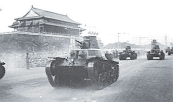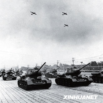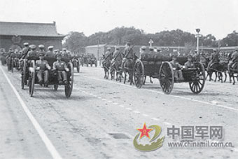 ![]() 参加开国大典阅兵的缴获95式轻战车 | ![]() 1950年国庆阅兵式上的马拉山炮方队 |