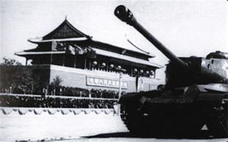 | 1954年国庆阅兵式上的T-34-85坦克,中国一度仿制了这种坦克,称为特-34型。不过后来随着苏联援助T-54A 坦克工厂到来,最终这种在现在的游戏里被称为“58式”的国产T-34 坦克并未成为解放军的主力装备 | |