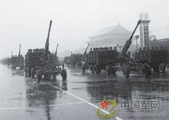 1956年,解放牌卡车牵引着国产85 毫米高射炮通过天安门广场,这场大雨中的阅兵式上,国产武器装备首次占据了不小的比例