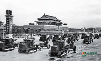 1955年,国产“东方红”拖拉机牵引苏制ML-20加榴炮通过天安门广场