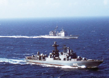 俄罗斯海军无畏级列夫琴科海军上将号跟踪美国海军提康德罗加级导弹巡洋舰