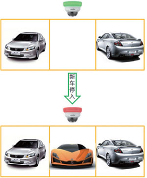 HIC3221EK-2CF36 提供三个连续车位的检测,当有存在空闲车位时点亮绿灯进行车位空闲提示,当停满三辆车时点亮红灯表示车位忙,为司机提供精确、快速停车诱导。过程如左下图所示: