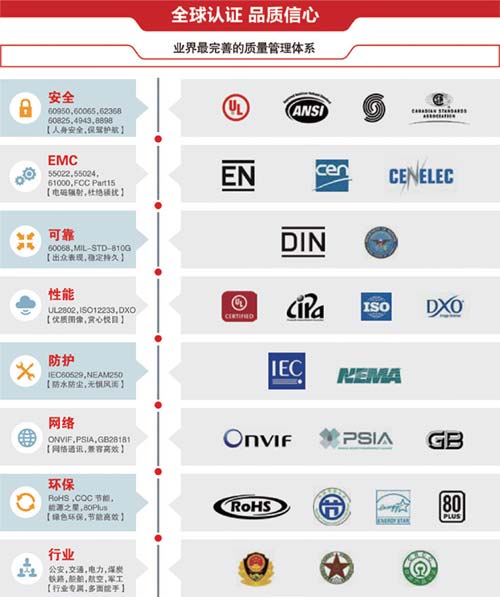 宇视品质信心-安全、电磁、可靠、性能、防护、网络、环保、行业等八大类全球主要认证