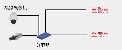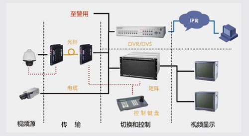 前端模拟摄像机通过同轴电缆(超距离通过一对光端机)接入到设备室,由视频分配器进行分配,分别给DVR、矩阵以及警用系统。矩阵及控制键盘实现本地实时图像的切换调看,DVR 实现视频的录像存储及回放。
