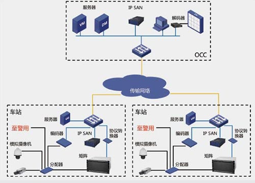 在每座车站/ 段/ 场部署8~16 路数字编码器,由矩阵输出模拟视频到编码器,编码器数字编码后,上传OCC,实现OCC 的远程实时图像调看;OCC 的管理平台通过站级部署的协议转换器,实现矩阵视频输出的选择以及球机云台PTZ 操作;OCC 的工作站从车站的DVR回放录像;OCC 部署的IPSAN 实现全线路重要录像的长期存储。