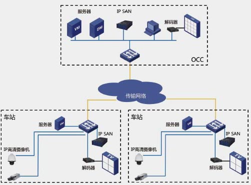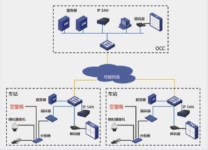 因此城轨CCTV 系统采用IP 数字智能监控系统,用IPSAN 磁盘阵列代替了DVR 存储,通过编码器将车站/ 段/ 场的模拟视频全部数字编码,通过站级--OCC 级的平台级联管理,实现全线实时视频的统一管理上传和统一的录像回放。