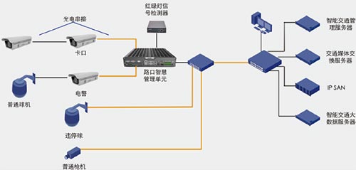 在机场陆侧区域的路口部署卡口抓拍摄像机,识别车辆的车牌信息以及拍摄车头、车辆前排信息;部署非现场执法设备,识别车辆的车牌信息以及自动分析违法过程;部署球机进行路口的动点视频监控;在道路接近路口位置部署交通流量视频检测摄像机,进行车道流量、排队长度等分析;在各道路部署枪机进行全路段的大场景视频监控;在禁停区域部署违停执法球机,自动识别违章停车行为。路口的摄像机可以采用1+1 两台摄像机光电串接,减少到路口设备项目的线缆部署;路口智慧管理单元提供多个电口和光口接入路口摄像机,实现抓拍图片合成,分析车辆类型、车辆品牌、车系及年份等功能,管理单元可缓存数天的图片信息、提高网络中断时信息存储的可靠性;系统支持多种方式判定信号灯状态:网络版红灯信号检测器利用网络将信号灯状态给摄像机,路口智慧管理单元通过网络与红绿灯信号检测器统一通信、并将交通流量参数通信给交通信号控制主机实现交通信号配时动态调整。