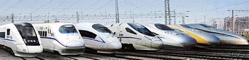 中国高铁打破了汽车行业“以市场换技术”的失败咒语:从左至右,依次是CRH1、CRH2、CRH3、CRH5、CRH380、高速综合检测列车、CRH380AM 综合检测列车