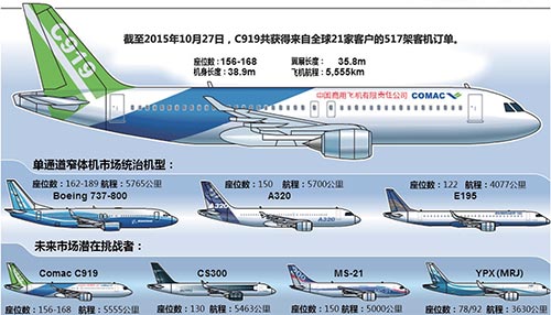 C919 的定位瞄准了民航市场中最大的一块:170 座级窄体干线中程客机。这类客机目前的代表产品是波音737 系列与空客A320 系列。先进的整体设计使C919 在许多方面表现出了后发优势,超越竞争对手。