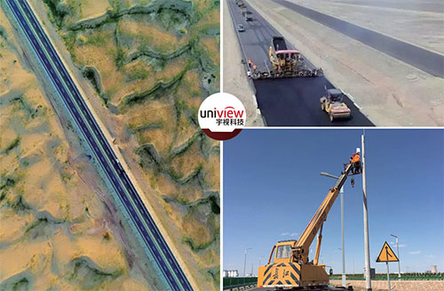 图:参建者在茫茫沙漠戈壁中开辟出了一条大漠天路(右上)、宇视设备部署施工场景(右下)