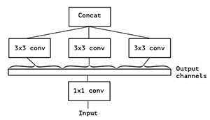逐层可分离卷积(Depthwise SeparableConvolution)可以认为是Inception 的扩展,它是Inception 结构的极限版本,如图4所示,一个简化版本的Inception,我们可以看做一整个输入做1x1卷积,然后切成三段,分别进行3x3卷积后相连,如图5所示。图4和图5两个形式是等价的,即Inception 的简化版本又可以用如下形式表达: