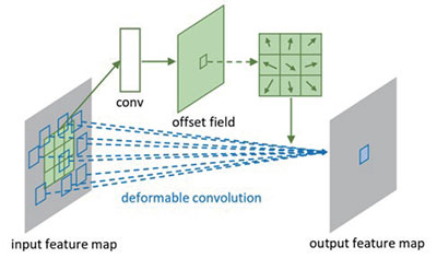 这个思想的实现方法也很常规,上图9中包含两处卷积,第一处是获取偏移(offsets)的卷积,即我们对输入特征映射面(inputfeature map)做卷积,得到一个输出(offsetfield),然后再在这个输出上取对应位置的一组值作为偏移。假设输入特征映射面的形状为batch*height*width*channels,我们指定输出通道变成两倍,卷积得到的偏移域(offset field) 就是batch*height*width*2×channels。为什么指定通道变成两倍呢?因为我们需要在这个偏移域里面取一组卷积核的偏移,而一个偏移肯定不能一个值就表示的,最少也要用两个值(x方向上的偏移和y 方向上的偏移)所以,如果我们的卷积核是3x3,那意味着我们需要3x3个偏移,一共需要2x3x3个值。取完了这些值,就可以顺利使卷积核形变了。第二处就是使用变形的卷积核来卷积,这个比较常规。