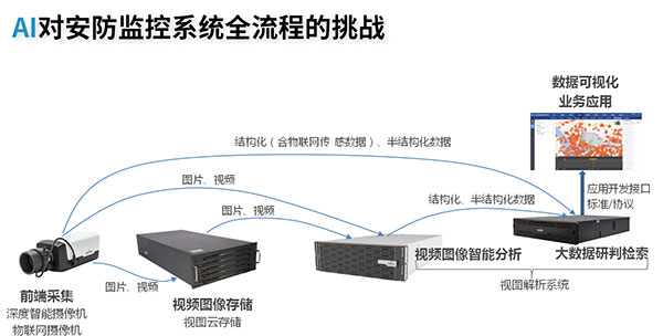 所谓“全流程的挑战”,是因为AI出现以后,摄像机的前端采集,不再只有视频,还有图片和结构化的信息,存储到后台后,将面临综合的智能分析,包括边缘计算、云端计算,这个业务流程都发生深刻的变化。