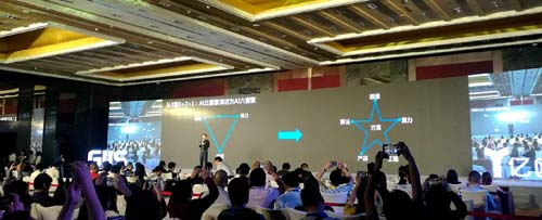 图 GIIS 2018,干货看举手拍照比例,宇视研究院院长谢会斌做《跨越AI大规模部署裂谷》三次燃场:AI三要素演进为六要素,即算力、算法、数据、工程、方案、产品;全系列以中国山脉和关隘命名的AI产品和方案,实战部署;IMOS大型操作系统。
