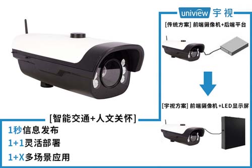 带着以上需求,宇视在很短时间内便推出了“自主式交通违法提醒系统”。雷锋网了解到,该系统直接由一颗装有AI芯片的前端摄像机与LED显示屏相连。而这也就意味着,摄像机在抓拍到违法行车、停车行为后,能够直接在前端处理,并在秒级时间内将结果反馈到LED屏幕,提前干预、中止交通违法行为。