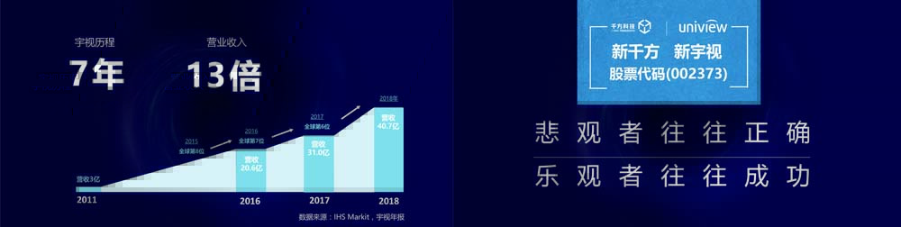 2018,宇视的第七年,我们冲过了四十亿收入大关。2018年,形势更为复杂多变,国内的去杠杆和地方债、国际市场的贸易战,所以全年超过30%的增长非常难得。在这里,我代表宇视科技管理团队,向全体同事的拼搏奋斗致以崇高敬意,对每位家属、每一位支持宇视发展的客户及合作伙伴、对千方科技及千方集团各兄弟部门致以深深的感谢。