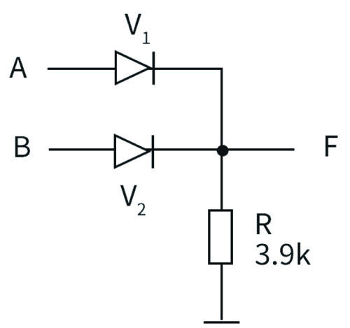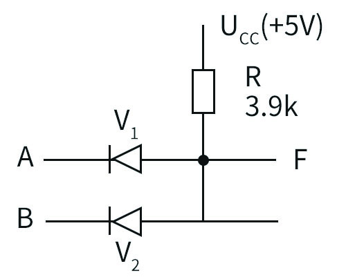 三角形代表二极管,箭头方向表示电流可通过的方向,AB是输入端,F是输出端。如果A不加电压,电流就会顺着A那条线流出,F端就没了电压;如果AB同时加电压,电流就会被堵在二极管的另一头,F端也就有了电压。假设把有电压看作1,没电压看作0,那么只有从AB端同时输入1,F端才会输出1,这就是“与门电路”。