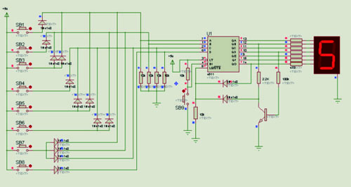 左边有8个输入端,右边有7个输出端,每个输出端对应一个发光管,7个发光管组成一个数字显示器。从左边输入一串信号:00000101,经过中间一堆的电路,使得右边输出另一串信号:1011011。1代表有电压,有电压就可以点亮对应的发光管,于是,就得到了一个数字“5”。(图7)