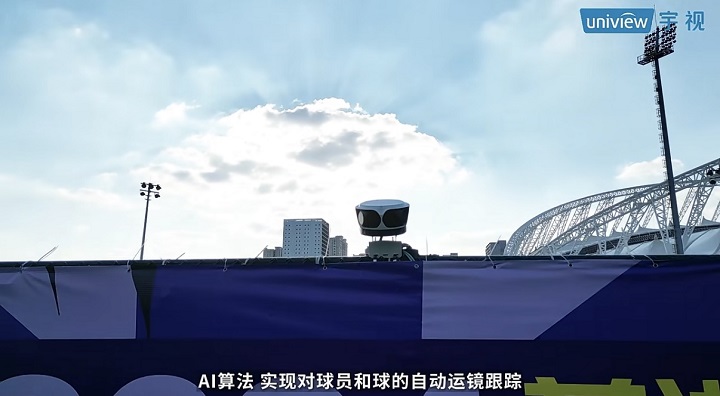 宇视科技研发的1600万像素超广角全景相机,可以通过多画面拼接与自动畸变校正技术,实现180°无死角覆盖。其核心创新在于AI算法——自动检测控球权并对球员、足球进行运镜跟踪,完成自动拍摄。这一技术减轻了人工摄影团队负担,拍摄内容可通过“宇视运动”小程序实时查看。对球迷而言,该技术打破了传统观赛的时空限制:赛前可参与线上竞猜,赛中实时观看直播,赛后获取回放与集锦,并支持在线剪辑分享。
