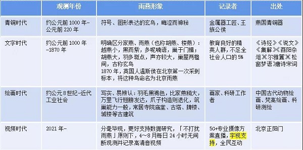 文字时代,记载丰富起来,信息支持辨读琢磨。张瀚是工部主事,张居正的同事,他的《松窗梦语》一手见闻详实,展现了明代人对雨燕(胡燕)比较明确的分类认知——燕有二种:越燕小,黑而紫,多呢喃语,巢于门楣;胡燕比越差大,羽多斑点,声亦较大,巢屋两楹间,古称玄鸟。作为吉祥物,“雨燕”出现的频次远不及家燕,如唐刘禹锡“旧时王谢堂前燕,飞入寻常百姓家”,这里家门口筑“燕窝”的明显是家燕;雨燕万里飞行翅膀发达,爪子构造则退化,希腊语中它们是“没有脚的鸟”(Apus),多依附大型古建筑衔草做比较简单的巢,因此雨燕也叫做楼燕。