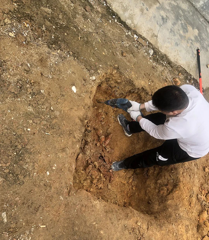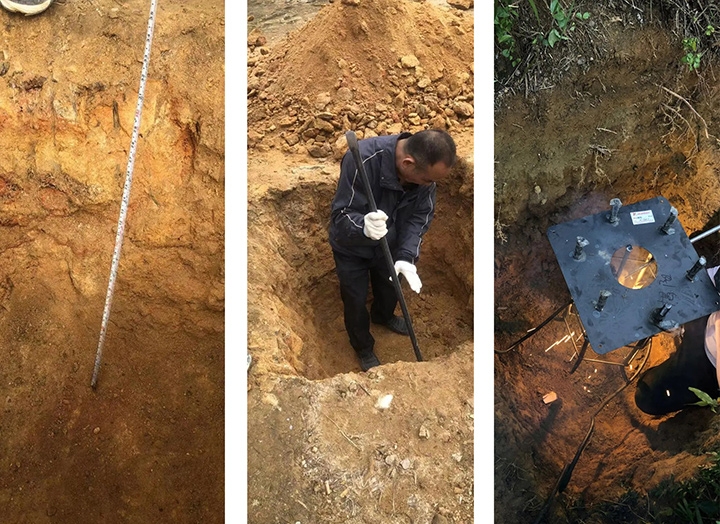 这里是广东省揭阳市一带,南濒南海,风力环境好,光照环境好。在这么深的坑里埋好基础设施,便能支撑起高杆的太阳能+风能供电设备部署,抗风,扎实。