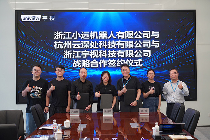 近日,杭州云深处科技有限公司(以下简称“云深处”)、浙江小远机器人有限公司(以下简称“小远”)及宇视科技在杭州签署战略合作协议。云深处总裁助理姚恒燕、小远副总经理吴兢业、宇视科技首席产品官朱兵共同出席签约协议。