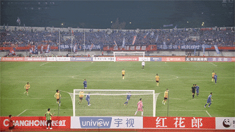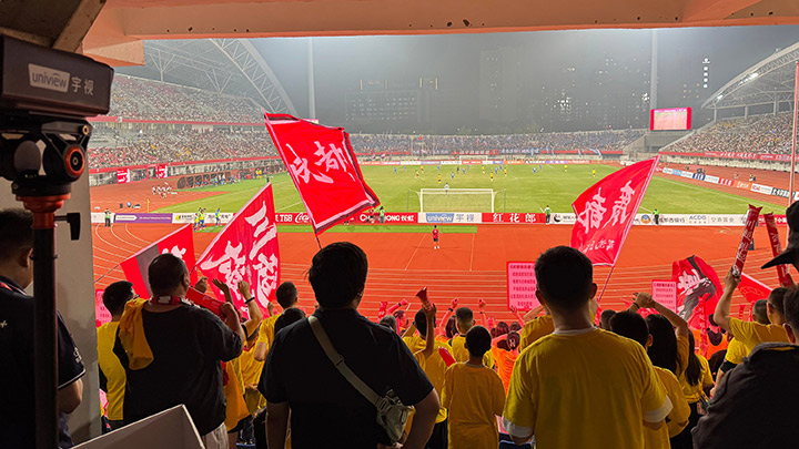 ▲揭幕战首粒进球,成都球迷摇旗呐喊,球门后视角宇视智能运动相机现场记录,慢动作运镜成片。