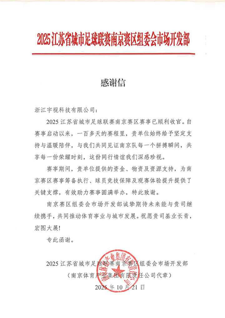 宇视科技作为苏超官方赞助商,深度参与赛事保障,收到了来自苏超组委会的感谢信,倍感荣光!