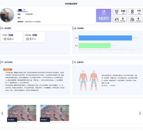 学校统一录入个人信息后,学生们只需举手识别就能开跑,支持多人同跑,发令、违规、成绩实时语音提示,日/周/月成绩自动排行,还能科学分析每个人的运动过程,输出测评报告,测试视频支持回放。