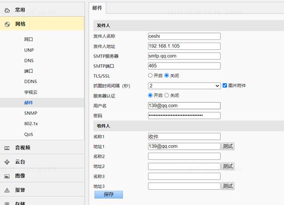 Web登录相机,进入【配置】-【网络】-【邮件】界面,配置相关的邮件信息参数。每个参数介绍如下: