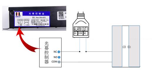 i. 配置开关量告警联动前,需提前做好摄像机尾线与电梯光幕间接线。光幕一般为常闭接线,可断开光幕NC与电梯控制板的接线,将设备尾线端子的常闭接口接入。接线如下图