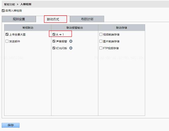 5、 根据需求配置联动方式,联动方式中声音报警和灯光闪烁默认开启。