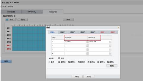 6、 联动方式配置完成后,配置布防计划。首先开启布防计划,点击编辑按需配置布防计划。