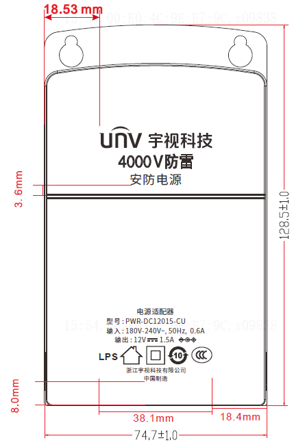 UNV DC12V/1.5A壁挂电源适配器