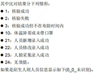 A:抓拍时间点+对比结果码+最高相似度值(1个值)+最高相似度对应的人员信息(人员ID+智能识别ID+姓名)+检测温度。