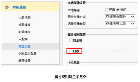 A:可以根据需求配置核验模板。若需取消口罩检测,在WEB界面,智能监控-高级设置-属性规则配置中不勾选“口罩”属性即可。